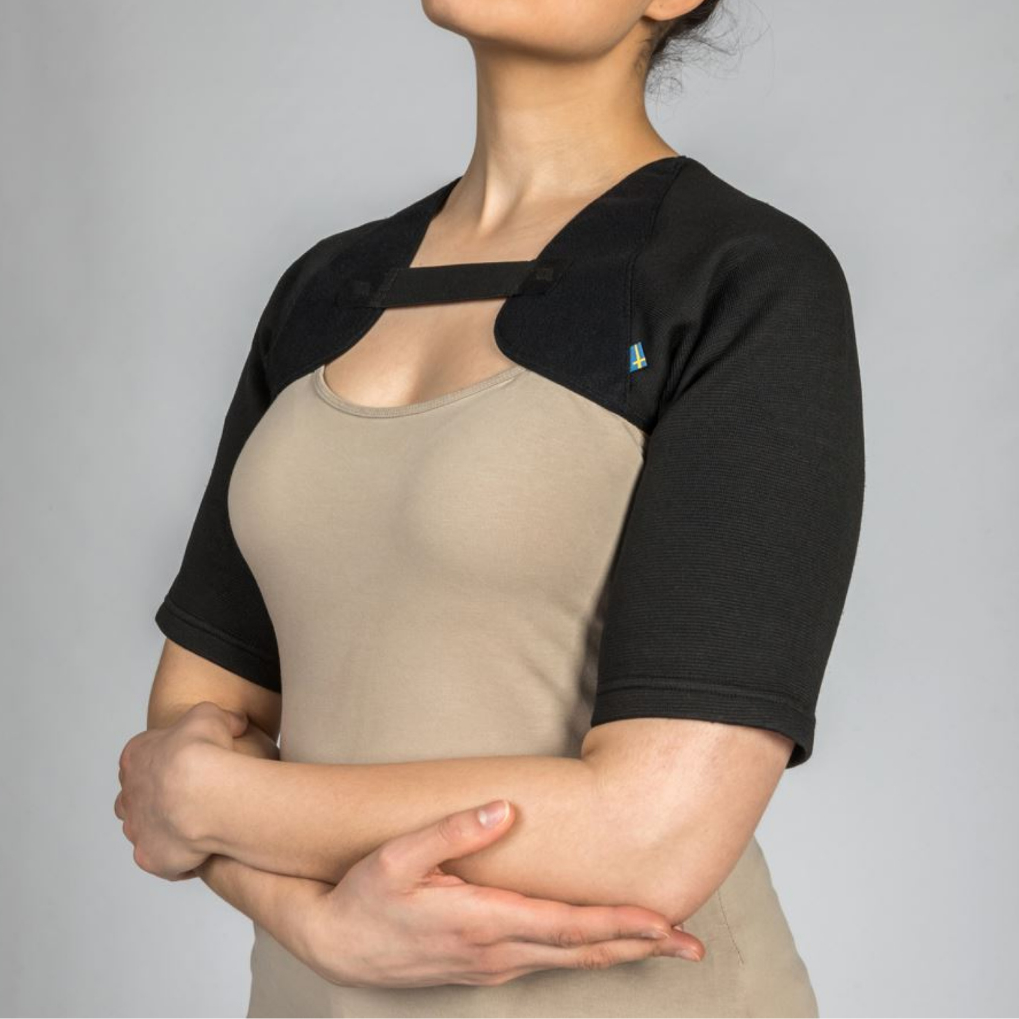 Denne skulderbeskytter i bolero-stil er designet til at lindre stivhed eller ubehag i skuldrene og det omkringliggende område. Den omslutter skuldre, skulderblade, overarme og øvre rygsøjle samt den øvre del af brystet. Beklædningen er anatomisk formet med et cirkulært mønster på skulderpunkterne for en tæt, blød og behagelig pasform. Beskytteren bæres som en jakke og lukkes foran med en elastik, der lukkes med velcro. Dette sikrer, at boleroen sidder på plads, og giver også mulighed for justering af pasformen. Tekstilmaterialet indeholder FIR- reflekterende mineraler. Effekten af FIR er velkendt for at hjælpe med at holde muskler og led varme og fleksible - samt fremme blodcirkulationen, lette restitutionen og øge velværet. Materialet i skulderbeskytteren er let elastisk, men fast. For at øge beskytterens fleksibilitet og brugerens bevægelsesfrihed er der indsat et panel bagpå, lavet af et mere elastisk jerseymateriale. Welltex®- och Iontex®-teknologi Anatomisk pasform Formstrikket Gummifri Omslutter skulderområdet Stimulerer cirkulationen Fremmer restitution Høj åndbarhed