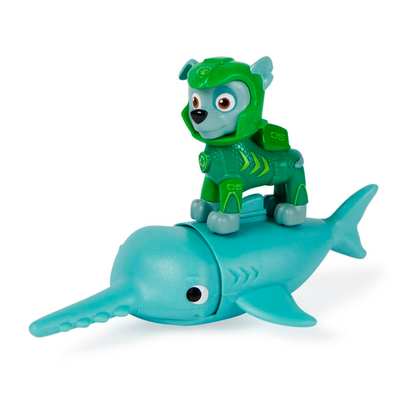 Send den søde Rocky i sin Aqua Pups våddragt og hjelm afsted på redningsaktioner på havet. Sæt Rocky fast på finnen på savfiskens ryg og rul den fremad for at aktivere hovedets bevægelse. Materiale: plastik Æsken måler: 19 x 20 cm. Fra 3 år Se alle varer med Paw Patrol
