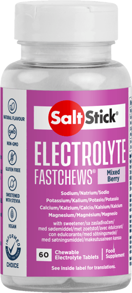SaltStick Fastchews er et kosttilskud, som indeholder de essentielle mineraler og salte, man sveder ud under fysisk aktivitet. Tyggetabletterne hjælper med at opretholde kroppens elektrolytniveauer og forbedre din præstation. SaltStick Fastchews Mixed Berry har en naturlig og forfriskende smag af blandede bær. Det anbefales at indtage 2 tyggetabletter pr. 15-30 minut ved fysisk aktivitet.