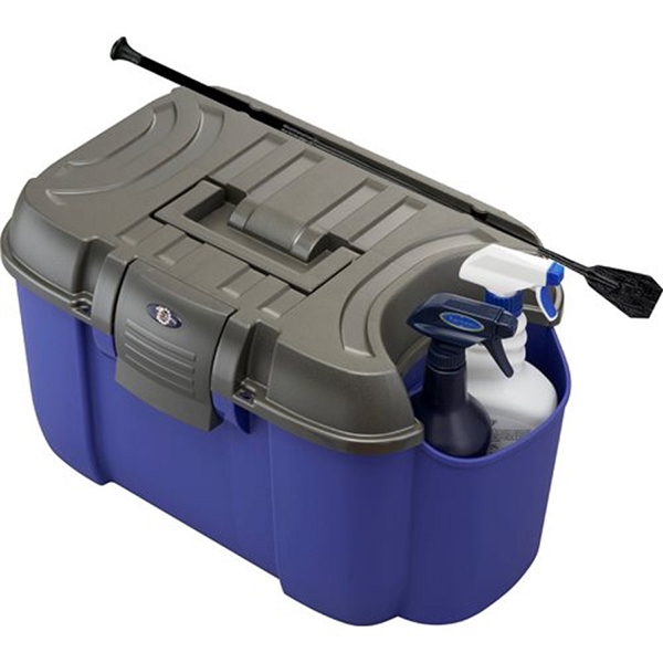 Striglekasse med praktisk udvendig rum til f.eks shampoo, showshine mm, der sikre at flasken altid står oprejst. Striglekassen er stor og rummelig med rigeligt med plads til alle dine strigler, børster, plejemidler mm. Udstyret med indbygget holder til pensel, rum indeling der er flytbar, samt mulighed for at sætte din pisk fast i låget. Du kan stå på mig - jeg kan bære op til 120 kg. Så her får du en rummelig striglekasse som du også kan bruge som skammel, når du eks. skal flette manen. Der er mulighed for at sætte hængelås på striglekassenkassen. Kassen måler : Dybde 34 cm Bredde 52 cm Højde 30 cm