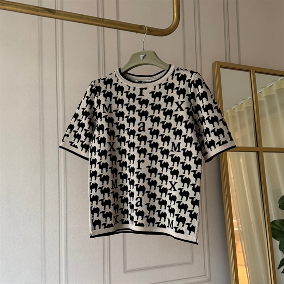 Den fine Higher strik fra 'S Max Mara er en kortærmet crew-neck sweater i fin, ren uldgarn med et jacquardstrikket mønster over hele trøjen. Kontrasterende stribedetaljer på kanterne.