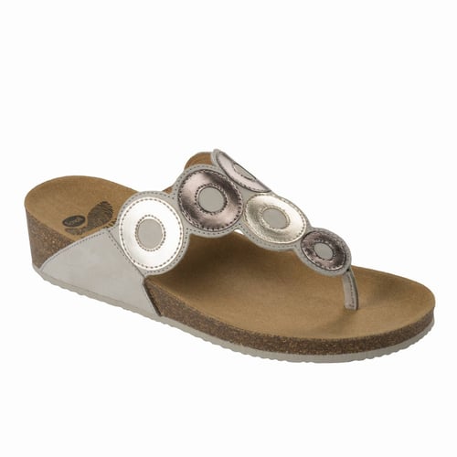 Arlene is the Scholl Bioprint® technology flip-flop fitted with the characteristic natural cork and rubber insole that has been ergonomically designed to help keep your foot in the right position. This is an elegant, feminine model with a nubuck leather upper and patent leather details.\n\n- The Bioprint® insole consists of a special combination of cork and rubber and it has been ergonomically designed around the natural anatomy of the foot to ensure stability and support\n- Its anatomy keeps the foot in the correct position, helping to prevent or relieve knee pain caused by an incorrect foot posture\n- The comfortable support of the foot arch and the embracing heel cup make it possible to walk naturally and to enjoy greater relaxation