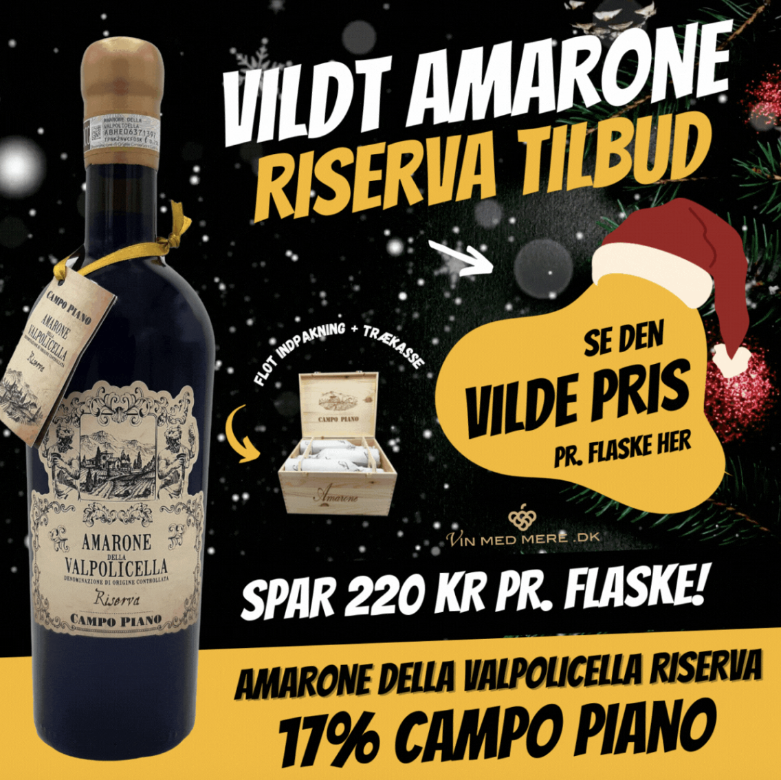 RISERVA AMARONE PÅ 17% - FANTASTISK RØDVIN! HELE 48 MDR. FADLAGRING HELT FANTASTISK AMARONE RISERVA FRA ØVERSTE HYLDE! KÅRET TIL EN AF VERDENS BEDSTE! KAN GEMMES I MANGE ÅR FREM. Vinen smager helt fantastisk, og det er nok den bedste nogensinde i denne superårgang. Dette er uden tvivl en af de bedst anmeldte og mest populære Amarone rødvine pt. Wauw, så er der fantastisk rødvin til alle vinelskere! I denne helt fantastiske og eksklusive Amaronedella Valpolicella Riserva DOCG 2021 på hele 17% får du virkelig en superb vinoplevelse på alle måder. Denne eksklusive topvin fra Tenuta Gugi, som er ejet af familie-vingården Falezza, er en total gennemført oplevelse, hvor der er kælet for ALLE detaljerne. Du fornemmer hurtigt at vinmageren har fået helt frie tøjler til at udføre sin grundighed og kærlighed til sit arbejde. Der er ikke sparet på noget. Det er ikke kun selve indholdet som er gennemført. Vinen kommer på en rigtig flot, tung og eksklusiv flaske, der er pakket fint ind i papir, og har gylden forseglingsvoks på toppen, samt en lille beskrivelse rundt om flasken. Sidst men ikke mindst, så kommer vinen i en eksklusiv og solid trækasse. OBS. OBS. vi kan kun sende trækassen med, når du bestiller alm. flexlevering. Vi kan IKKE sende trækassen med, hvis du bestiller til en pakkeshop. ★★★★★ GULD MUNDUS VINI ★★★★★ GULD BERLINER WINE TROPHY ★★★★★ GULD GILBERT & GAILLARD + 95 POINT! ★★★★/★ VILDE 4,4 PÅ VIVINO! (på tværs af årgange) AMARONE RISERVA 17% - 48 MDR. FADLAGRING!: Amarone della Valpolicella Riserva Campo Piano på 17% er skabt på et helt nøje udvalgt drueblend bestående af 60% Corvina, 20% Corvinone, 15% Rondinella og 5% Oseleta fra vingårdens egne vinmarker i Campiano, oppe på bjergskråningerne over 600 meter fra havets overflade, hvor druerne håndplukkes. Det er udelukkende de absolut bedste druer, som bliver godkendt til denne vin. Vinen er lavet på den berømte Appassimento metode, hvor druerne får lov til at tørre, og i dette tilfælde hele 3 mdr. for at fremhæve den lækre dybe farve, duft og smag. Vinen gennegår fermentering 30 dage, for dernæst at komme HELE 48 mdr. på fine franske egetræstønder. Til sidst kommer vinen på flaske, hvor den opbevares før den frigives til salg. Dette er en super lækker, blød og smagfuld top Amarone med masser af rund fylde og skøn intens duft: Farven: Helt dyb og intens farve, men et lille hint af orange skær fra de 48 mdr. på fad. Duften: Du bliver straks mødt af en meget intens duft af fuldmoden mørk frugt og mange lag af forskellige indtryk som sort peber, lakrids og vanilje. Smagen: Woow en helt fantastisk fløjlsagtig og smagfuld oplevelse, fyldt med lækker moden frugt og noter af kirsebær, delikate krydderier, lakrids samt vanilje. Powerfuld på en utrolig rund, blød og elegant måde, som understreger kvaliteten i denne rødvin. Du vil opleve masser af dejlige bløde runde tanniner og en virkelig lang flot finish, som bliver ved. Pas på - man får lyst til meget mere af denne super lækre Amarone della Valpolicella Riserva. VIGTIGT! Vinen skal åbnes min. 2 timer før servering, og kan med stor fordel hældes på karaffel. Historien om denne eksklusive Amarone Riserva: Denne lækre rødvin kommer fra et berømt vinhus, nemlig familie-vingården Falezza, som startede vinproduktionen tilbage i år 1974. Vingården ejer eksklusive jordstykker rundt om i Verona, og denne lille vinmark som leverer de forskellige druer til denne vin, er kun på 3 hektar. Vi fortalte dem om vores tanker, om at kunne sælge en eksklusiv top Amarone Riserva på højeste niveau til en super stærk pris i Danmark. Vingården Falezza har i den grad levet op til vores drømme, og de har sørget for de bedste druer til denne skønne Amarone Riserva rødvin, som der kun laves ganske få tusinde flasker af årligt, for at holde kvaliteten helt i top. Tenuta Gugi som står bag denne Amarone della Valpolicella Riserva 17% Campo Piano er familiens eget kvalitetsbrand, og her kæler de virkelig for vinene. Tenuta Gugi har været et selvstændig vinhus siden år 2000. FØRST-TIL-MØLLE!
