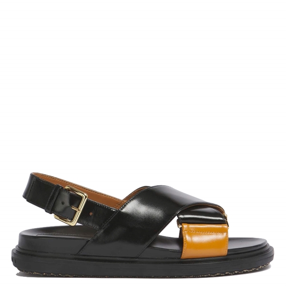 Ikonisk Fussbett sandal fra MARNI med remme på kryds og tværs i det blødeste glatte kalveskind med rektangulære ringe og rygrem med fin metalspænde. Disse MARNI sandaler har det fineste guld hardware og kommer denne gang i en klassisk sort farve med brune detaljler - som gør dem dejlig klassiske og cool. Sandalen er produceret i Italien og udformet i det blødeste læder og designet med læder indersål samt ydersål i jute. Et par super lækre MARNI sandaler med den bedste komfort, som du både kan bruge i efterårssæsonen med en cool strømpe eller til sommer.