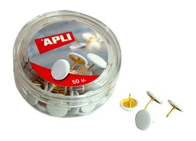 Chinchetas niqueladas de diámetro Ø 10 mm. Cabeza redondeada en color blanco y puntas afiladas para facilitar su inserción. Cada caja contiene 50 chinchetas.\nUn producto imprescindible para tener siempre en casa y la oficina, ideal para sujetar papeles o fotos en corcho, colgar imágenes o posters en paredes, aplicar en tapicerías y madera, etc.