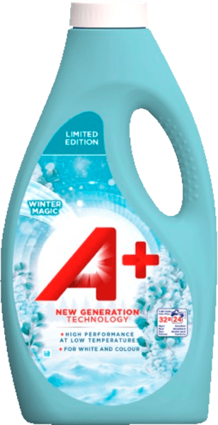 A+ Winter Magic er et limited-edition vaskemiddel, der leverer en fejlfri rengøring, selv ved lave temperaturer. Dets avancerede formel sikrer høj ydeevne i koldtvandscyklusser og tager sig af både hvide og farvede tekstiler. Hold dit tøj strålende og levende, mens du nyder en frisk duft, der fanger vinterens renhed. Med A+ Winter Magic har vinteren aldrig føltes så hyggelig, og rengøringen har aldrig været så effektiv. Flasken er fremstillet af 97% genanvendt plastik og er helt genanvendelig.