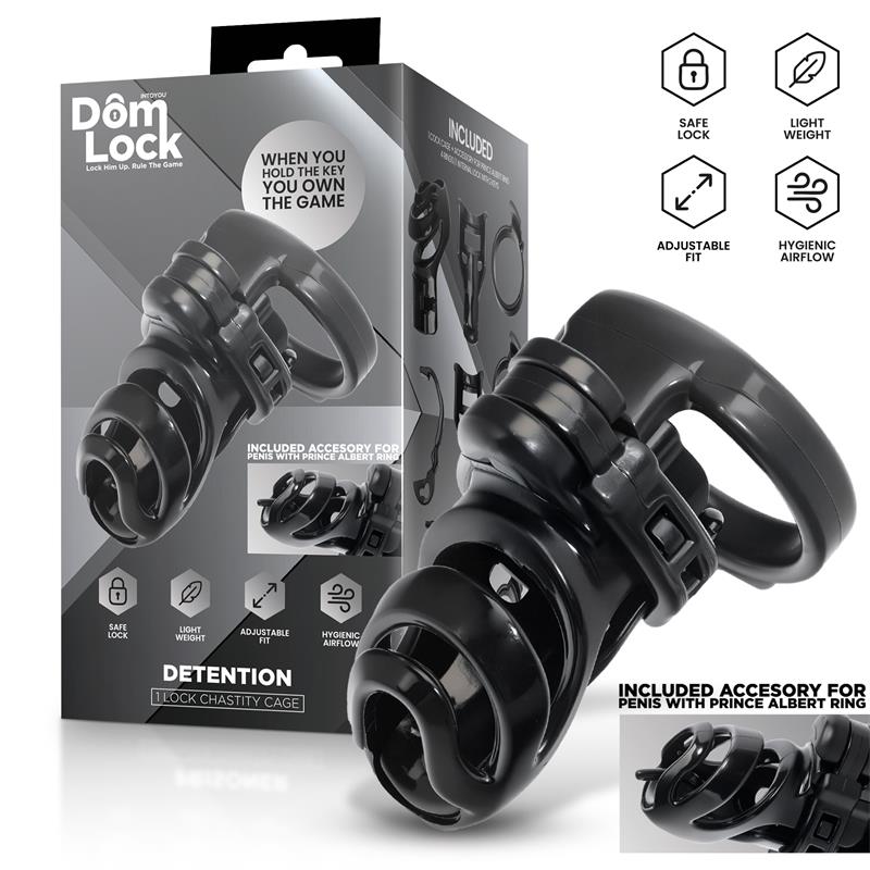 Tag kontrol med Domlock, dit mærke af penisbur, der vil frigøre dit ønske. Med dette penisbur kan du mestre kunsten at underkaste dig én gang for alle. Disse bur giver dig mulighed for at vække lidenskab ved at låse ønsket væk, inden for rækkevidde, eller din penis. Mere end bare et bur, er Domlock et mærke, der lover fornøjelse ved at blande fornemmelsen af overgivelse og underkastelse med lidenskab og seksuel frihed. De er perfekte til langvarig brug, idet de kombinerer funktionalitet og komfort. De har en høj-kvalitets låsemekanisme, der giver dig mulighed for at låse din partners erektion på en erotisk og effektiv måde. De har et ideelt design til hygiejnisk luftstrøm og lette materialer for optimal komfort og pasform. Detention er et meget specielt cockbur, designet til dem med Prince Albert-piercinger. Detention kommer i to dele: en standard og en anden med et tilbehør til denne type piercing. Lås dine ønsker op og giv magten over din fornøjelse til den, du vil, og før spillet af dominans. Mål: 9,3 cm x 3,7 cmIncludes: Cockbur 1 intern lås og 2 nøgler Tilbehør til Prince Albert ring4 pubic ringe 3,8 cm 4,4 cm 5 cm 5,5 cm
