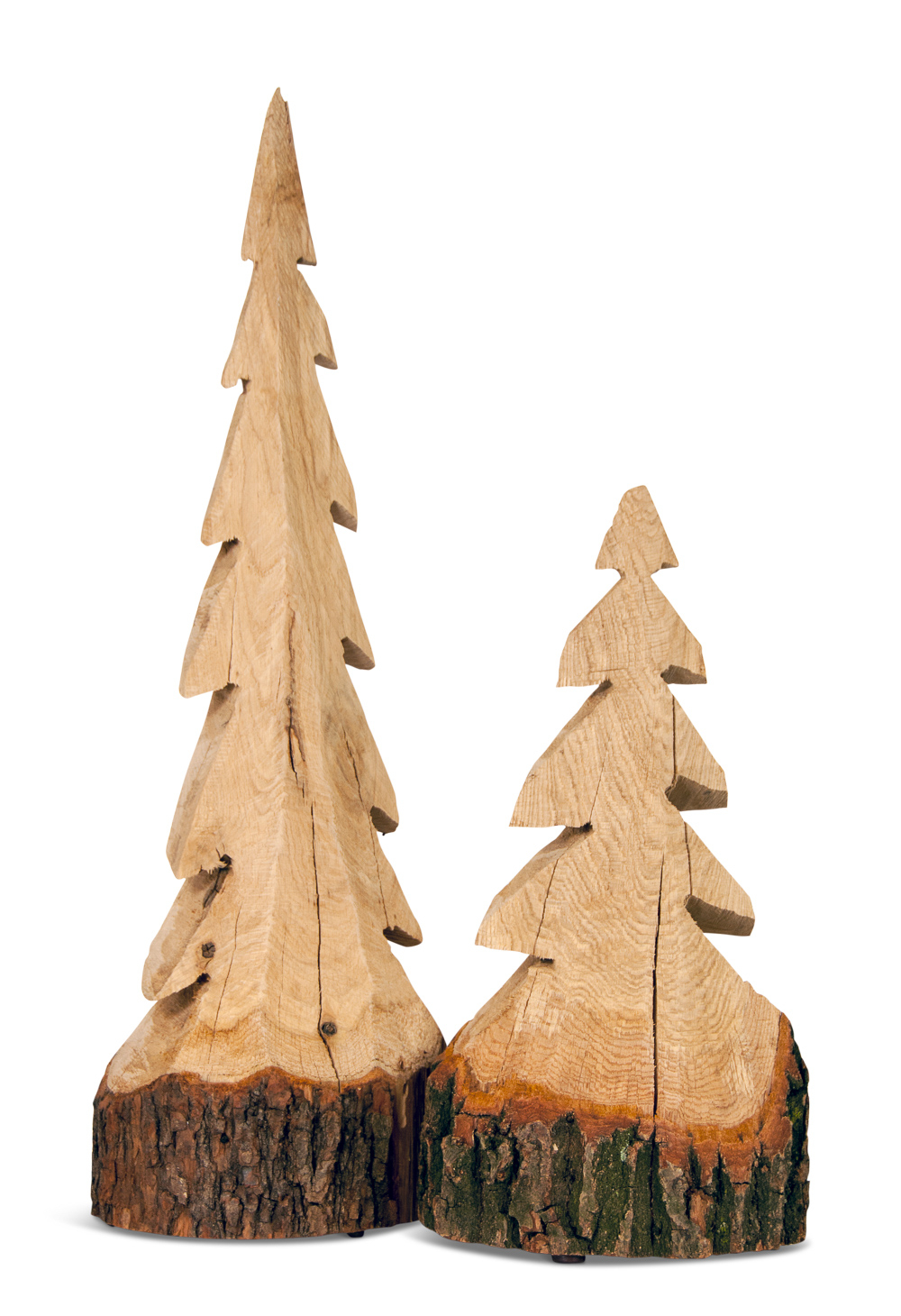 Få naturen ind i huset med disse skønne juletræer.Træerne er af eg og derfor et naturmateriale.Der kan være skævheder og manglende bark, men det gør bestemt ikke juletræerne ringere. Det sætter sit unikke præg på netop dette julepynt.Juletræerne er håndlavede.Træet er ubehandlet.Lille 50 cm.Stor 70 cm.