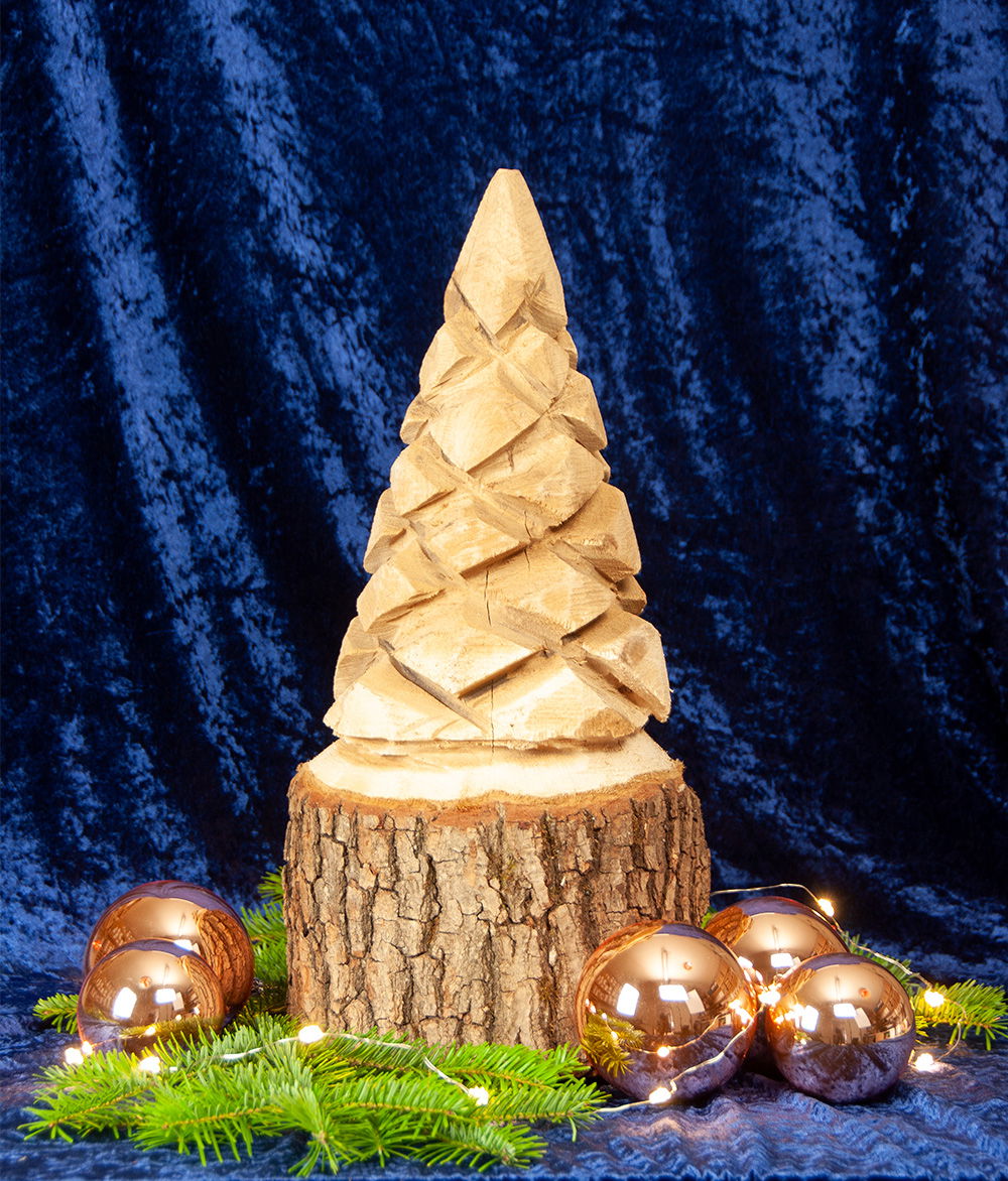 Julepynt af naturmateriale som giver et flot og rustikt udseende.Hvert juletræ er unik i sin form, da træet bliver skåret direkte ud af en stamme.Juletræet er håndlavet med en special saveteknik.Træet er ubehandlet.