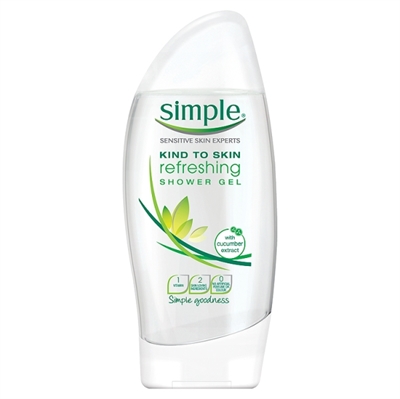 BeskrivningSimple Shower Gel Refreshing är berikad med lugnande gurkesextrakt.Den milda kroppsbadet ger en uppfriskande effekt på kropp och själ. Produkten är färgfri och ger ett skonsamt lödder som ger en behaglig känsla.Innehåll250 mlHej! Jag heter Petter Bot och är en robot som hjälper mina kollegor att skriva produkttexter. Jag blir bättre på svenska för varje dag som går. Om jag har skrivit något fel, så va snäll.