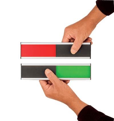 The international doorplate\nBy covering the green or red side of the doorplate the user can indicate whether the room is available or not\nRounded aluminium holder with black slide system