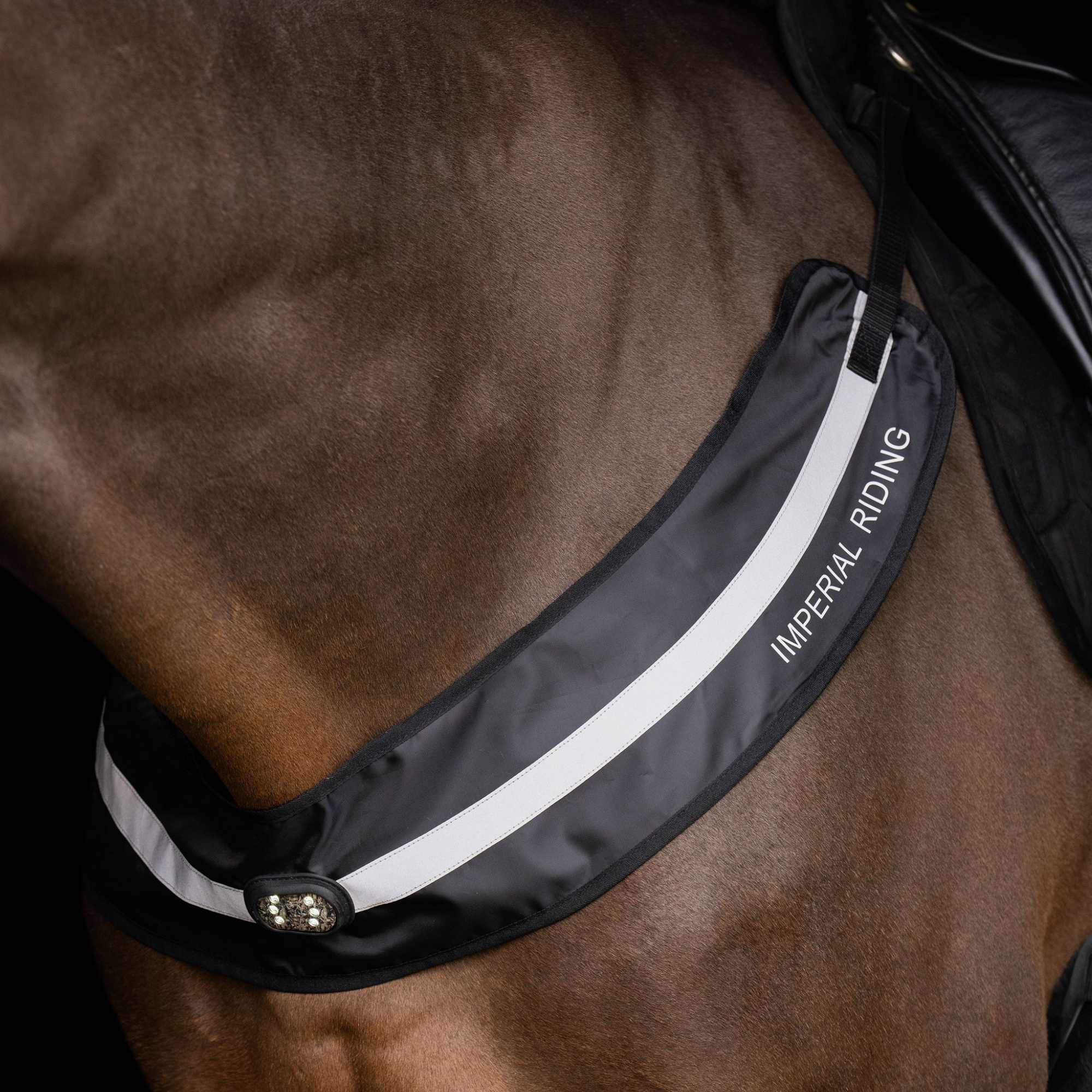 IRH-Luminous Breast Plate – Markant, Reflekterende og Funktionel Gør din ridetur lysere med IRH-Luminous Breast Plate, det ultimative statement-tilbehør til rytteren, der tør skinne igennem. Dette iøjnefaldende dækken kombinerer glamour, stil og sikkerhed og tilfører dit rideudstyr selvtillid og individualitet. Den er designet med reflekterende detaljer og en central LED-gummiring, hvilket sikrer maksimal synlighed under rideture i skumringen eller tidlig morgen. Det fastgøres let til din sadel med sikre velcrolukninger og forener funktionalitet med blændende elegance. Med dette bryststykke er du sikker på aldrig at gå ubemærket hen, uanset om du træner, rider tur eller nyder en aftentur. Praktisk velcromontering på sadlen for hurtig og nem brug. Central gummiring til sikker fastgørelse af LED-lys der oplades via USB stikket. Reflekterende stribe forbedrer synligheden markant i svagt lys. Holder dig sikkert synlig for modkørende trafik. One size OBS Leveres uden USB Lader Neogrøn lampe, der dog lyser hvidt