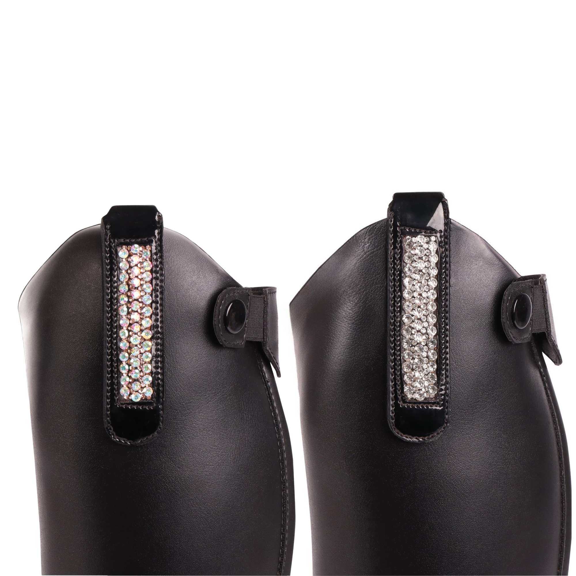 Krystal-støvleclips – Elegant pynt til dine ridestøvler Giv dine ridestøvler et ekstra pift af elegance med disse smukke krystal-clips med blank lak overflade. De tilføjer øjeblikkeligt lidt "bling" og luksus til dit look. Clipsene er designet til at være super nemme at montere direkte på støvleskaftet. Sort