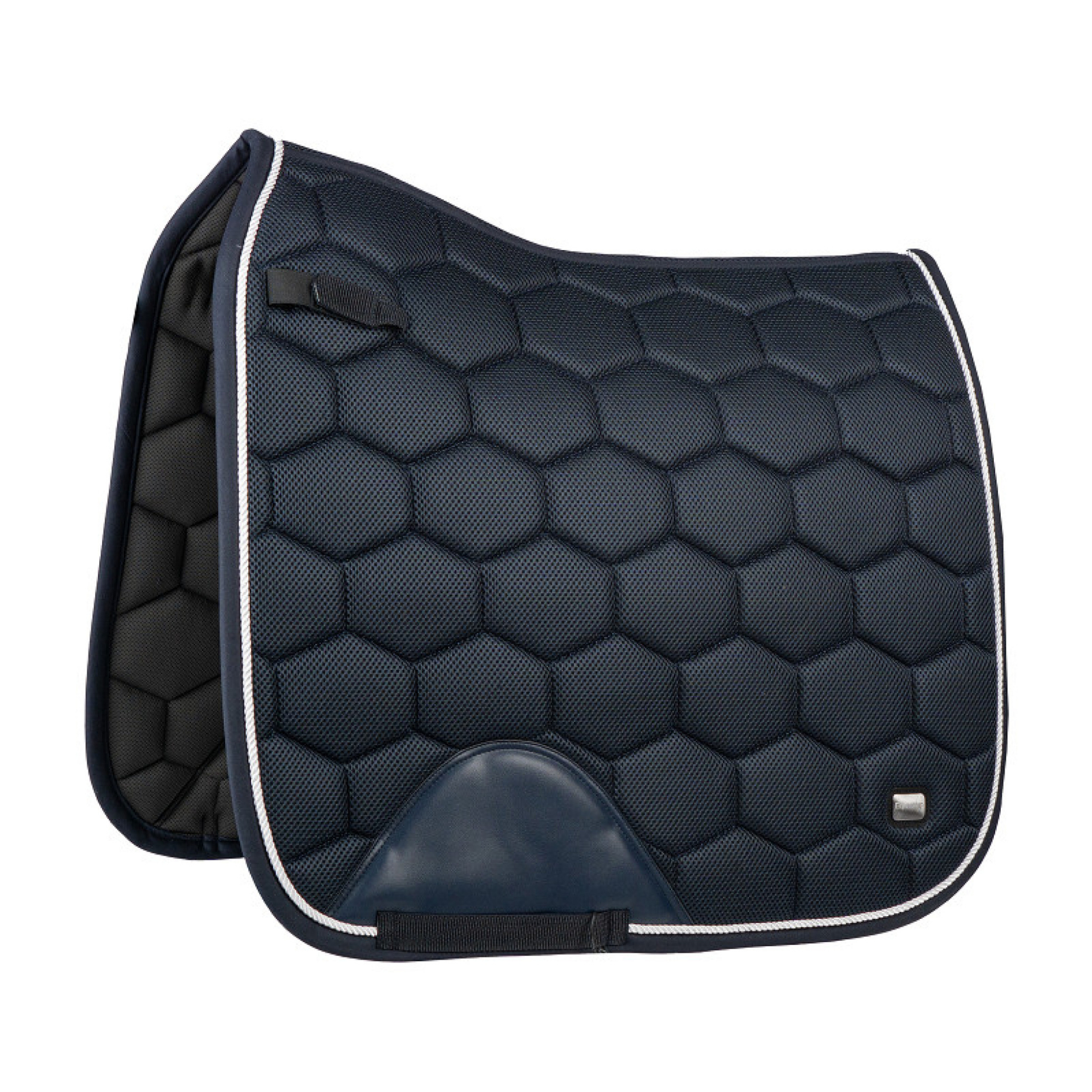 Elegant og åndbart dressurunderlag i mesh - Navy Stilfuldt dressurunderlag fremstillet i åndbart mesh-materiale, der sikrer god ventilation og komfort for hesten. De smukke hvide piping giver et eksklusivt udtryk, mens den anatomiske pasform med høj manke sikrer optimal komfort og bevægelsesfrihed. Underlaget er designet med slidstærke PU-forstærkninger ved gjordstropperne samt en elastisk D-ring-strop, som giver en stabil og funktionel fastgørelse under ridning. Produktegenskaber: Åndbart dressurunderlag i mesh Elegante hvide pipings Anatomisk formet med høj manke D-ring-strop med elastisk indsats Slidstærke PU-forstærkninger Materiale: 100 % polyester Kantbånd: bomuld