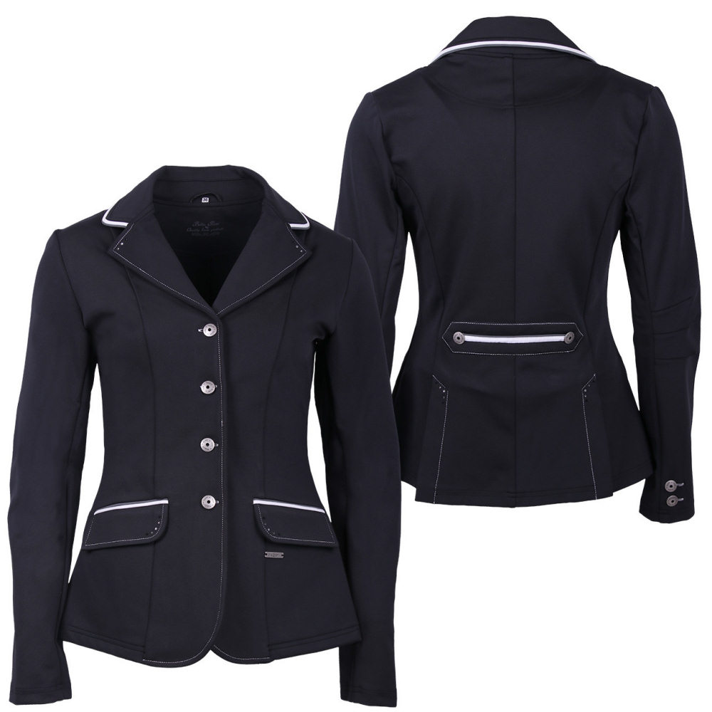 Flot figursyet QHP Coco stævnejakke i et classic look med chic detaljer Har et trefarvet tema på kraven, lommerne og ryggen. Yders behagelig at have på grund af det strækkende softshell matriale. 50% polyester, 45% nylon, 5% lycra Lavet af let strækende 280 gsm softshell Knaplukning, knaphul med hvid søm Hvid piping på kraven, lommer og ryg Kontrast hvid syning langs revers- og rideslidser bag Udstyret med to klaplommer. Rhinestones / crystal på lommeklapper, revers- og rideslidser bag