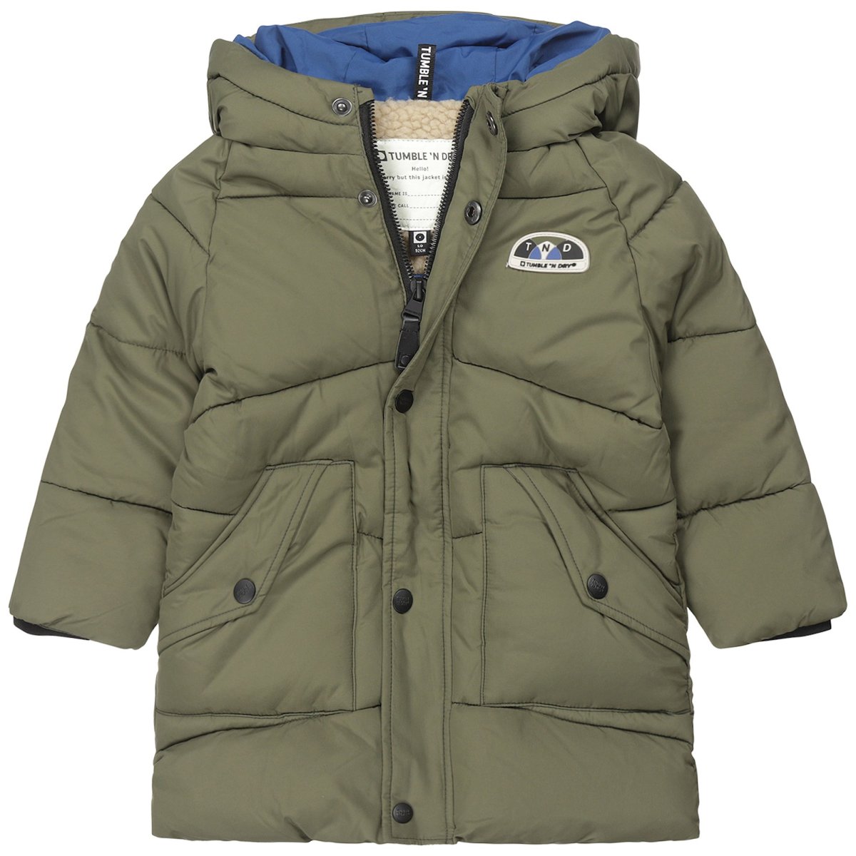 Kode rød? Med denne seje, militærgrønne puffede jakke er drenge klar til alle slags vejrforhold. Jakken er lavet af blød og vandafvisende genanvendt polyester og er udstyret med en hætte, en solid skjult lynlås, en trykknaplukning, to klaplommer med trykknaplukninger og ærmer med elastiske manchetter, der ikke lader en vindpust slippe igennem. Jakken og hættens foring er skrigblå, og fyldet i jakken er lavet af bæredygtige Sorona®-fibre. Et must-have! Vores model er 92 centimeter høj og har størrelse 92 på.