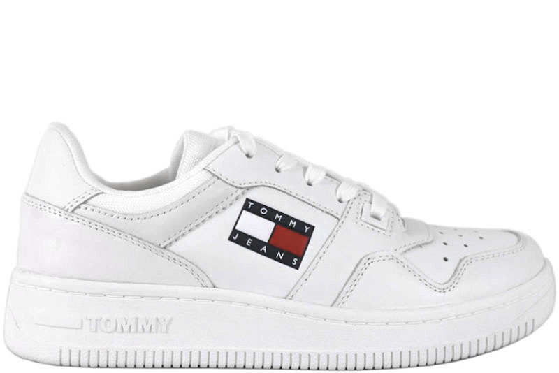 TOMMY HILFIGER TOMMY JEANS RETRO BASKET WMN. Flot sneakers fra Tommy Hilfiger i hvidt skind. Modellen er foret med tekstil indvendigt og en hvid gummisål. På siden er Tommy Hilfigers logo i deres originale farver blå, rød og hvid. Udtrykket er klassisk men i en fed retro bakset stil. .. Læs mere på https://www.juul-sko.dk/damesko/dame-fritidssko/tommy-hilfiger-11407-str37.htm