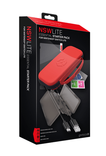 Produktbeskrivning The Gioteck NSW Lite Essential Starter Pack gives you everything you need for your Nintendo Switch™ Lite. Including a premium hard case with carry handle alongside a 4-game case for gaming on the go, a tempered glass screen protector with soft cloth to protect your Nintendo Switch from scratches and a 2m USB C cable for fast charging. Gioteck – Come Get Some. SPECS: Premium design hard case Tempered Glass screen protector Game Card Case USB charging cable