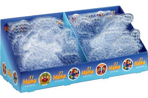 Stiftplader til Hama perler. Stiftpladerne fåes både som formstøbte firgurer og plader, hvor man kan lave sine egne mønstre og motiver.