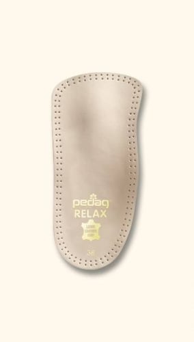 Enjoy the day - with the wide short foot support for relaxed feet, pedag Relax. Gives comfortable shoes even more comfort and relieves the feet.\n\nBest of the day? If you can relax and take off your shoes in the evening. This is no problem with the comfortable foot support pedag Relax, because the name says it all: The elastic and particularly flexible foot support with forefoot pad and longitudinal arch support prevents a splayfoot, gently cushions the heel and gives the whole foot healthy and soothing support. Thanks to its short shape, the toes retain all the space they need to feel comfortable.\n\npedag Relax is a relief for strained feet and makes comfortable shoes even more comfortable - thanks to its anatomical shape, the short foot support is comfortable to wear even when you have problems with flat or splayfoot. The breathable leather absorbs the moisture of the foot and thus ensures a pleasant climate in the shoe. For heavenly comfort, all day long.\n\nFind your ideal footbed - with pedag. Feels good.\n\n- relieves the arch of the foot\n- cushions the splayfoot\n- stabilizes the heel\n- comfortable shape for wide shoes\n- flexible and elastic