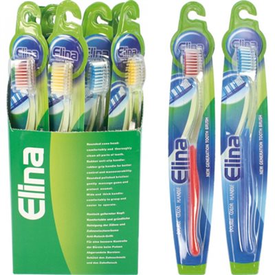 De flesta tandläkare och tandhygienister är överens om att du ska byta tandborste när den ser sliten ut, ungefär var tredje månad. Studier visar att tandborstar efter tre månaders normalt slitage tar bort plack från tänder och tandkött mycket mindre effektivt jämfört med nya tandborstar. Borsten bryts ner och når inte längre lika effektivt in i alla små hörn utav dina händer. Toothbrush Elina Double Colour 12pcs in Display är formad för enklare tillgång till svåråtkomliga platser. Ergonomiskt utformat handtag som ger bra komfort och bra kontroll.