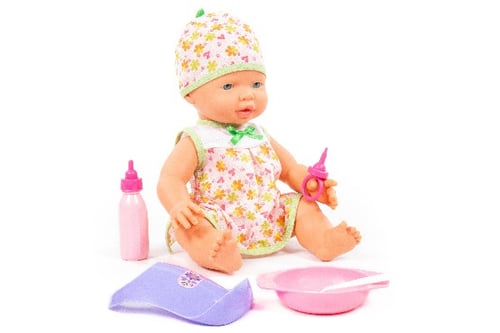Dukke pige 35cm m/sut, hagesmæk, flaske, tallerken
