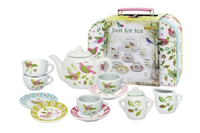 Te uppsättning av porslin, packad i matchnings resväska, innehållande en tekanna m. LID, 4 koppar, socker och creamer skål 4 samt rätter. En träff med alla barn som gillar att bjuda in familj, vänner, dockor och nallar till selskab.3 +Hej! Det är jag som har översatt sidan. Jag är en robot, så det kan ibland bli lite fel ibland eftersom jag fortfarande håller på att lära mig!