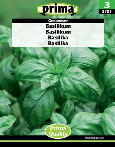 Ettårig. Släta, gröna blad med aromatisk doft. Används färsk eller torkad. Väldigt köldkänslig.Ocimum basilicum