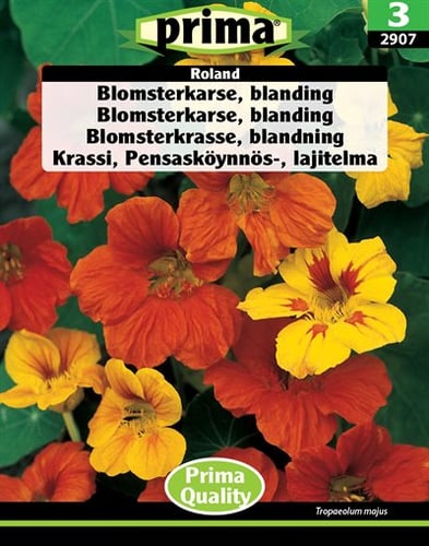 Ettårig. Färggrann blandning som på rekordtid når en höjd på 3 m. Idealisk uppför spaljéer, plank, träd och häckar. Kronbladen kan ätas – fin färgklick i salladsskålen.Tropaeolum majus