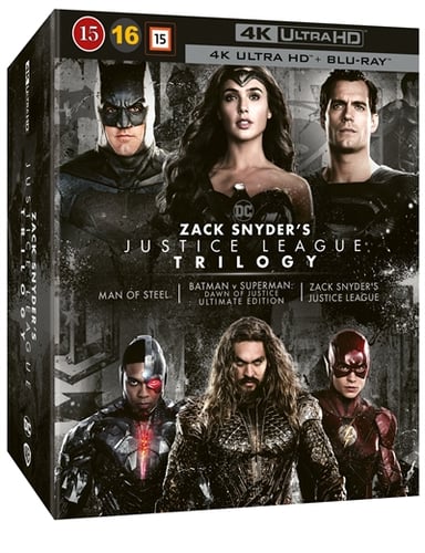 BeskrivningIncludes Man of Steel, Batman V Superman Ultimate Edition , Zack Snyder's Justice League. A young boy learns that he has extraordinary powers and is not of this Earth. As a young man, he journeys to discover where he came from and what he was sent here to do. But the hero in him must emerge if he is to save the world from annihilation and become the symbol of hope for all mankind. Featuring an all-star cast, Man of Steel offers up an entirely new Superman: alienated, misunderstood, but forever a beacon of hope. The extended cut of ""Batman v Superman: Dawn of Justice"" includes 30 more minutes not seen in theaters! Also includes the Theatrical Version of the film. Fueled by his restored faith in humanity and inspired by Superman’s selfless act, Batman and Wonder Woman recruit a team of metahumans to stand against a newly awakened threat.Specifikationer:Vikt:4,8 KGFormattyp:4K Blu-Ray