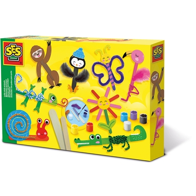 With this crafting set from SES Creative, you can craft fun animals with ice cream sticks. Use the instructions to quickly make a fun flamingo, sleepy sloth or a dangerous crocodile. Paint the ice cream sticks and stick the paper shapes, feathers, googly eyes and chenille pipe cleaners on top. Which animal will you make first?21 ice lolly sticks in two sizes Glue Six colours of paint Brush Feathers Chenille pipe cleaners Printed details Googly eyes in two sizes Instructions. Real wooden popsicle sticks in two sizes; Bring your animals to life with the additional supplied handicraft materials; Stimulates creativity; Develops motor skills. Age: 5+ Made in Holland.
